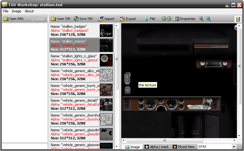 По этому списку смотрим наши текстуры в stallion.txd. Лишнее текстуры удаляем. У нас остаётся 8 текстур. Командой Flip переворачиваем текстуры.