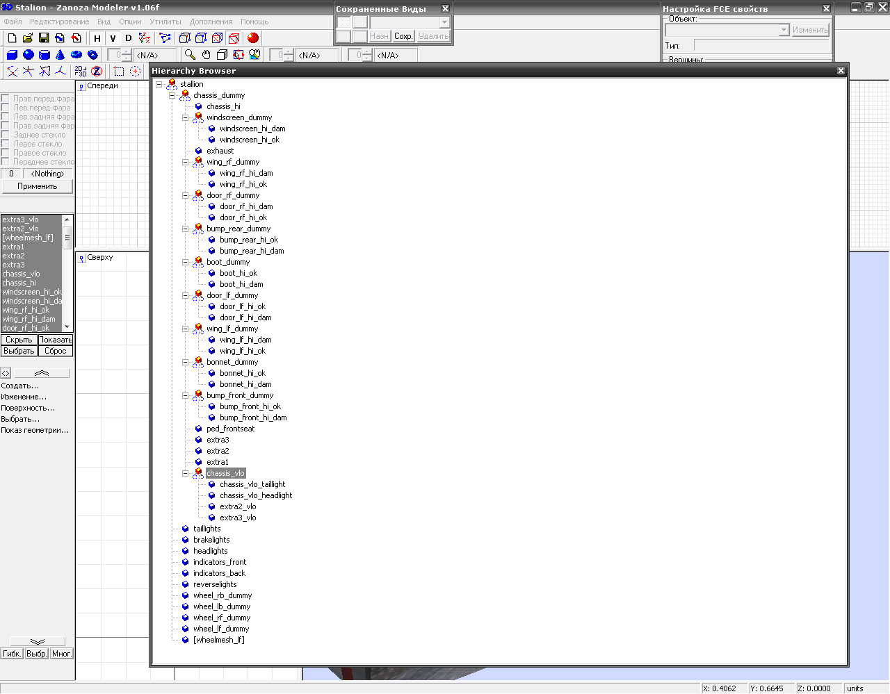 С объектами закончили, перейдём к Dummy. Поскольку ZModeler2 экспортнул модель без дамми, мы будем заимствовать их от оригинального Сталлиона. Для этого удаляем у оригинального Сталионна все объекты, кроме chassis_hi (не даммми!)