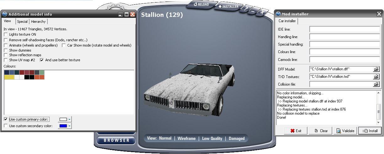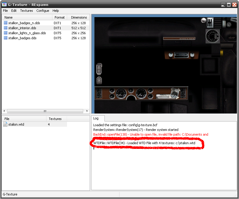 Превым делом извлечём с помощью OpenIV модель и текстуры выбранного авто. Извлекать будем из архива vehicle.img, который находится по адресу (если мне не изменяет память) Grand Theft Auto IV\pc\models\cdimages. Текстуры имеют формат .wtd, а модель .wft. Я выбрал Stallion, следовательно будем извлекать stalion.wtd и stalion.wft. Но это ещё не всё. Основные текстуры содержатся в vehshare.wtd и в vehshare_truck.wtd, их тоже извлекаем.Теперь будем извлекать текстуры из .wtd. Делаем это с помощью G-Texture (или через OpenIV, но я забыл как это сделать). При открытии G-Texture может выдать такого рода ошибку: BackEnd::openFile(138) - Unable to open file, invalid file path: C:\Documents and Settings\%имя пользователя%\Рабочий стол\stalion.wtd