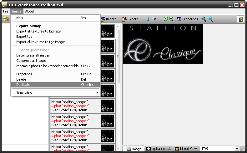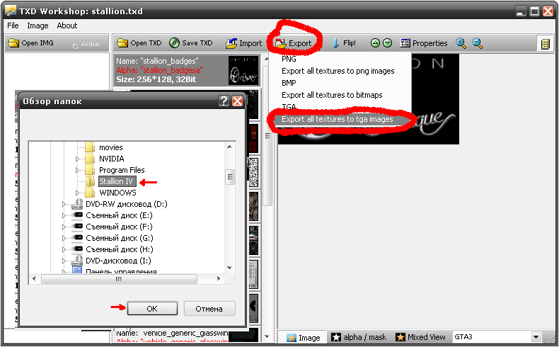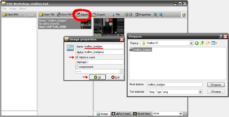 Теперь переименовываем stallion8bit128 в stallion_badges, ставим галочку на Alpha is used, жмём Ok и импортируем текстуру stallion_badges. Текстура дожна быть формата .png или .tga. TXD Workshop не может работать с .dds текстурами