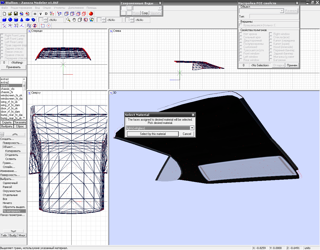 Итак, у нас баг со стёклами на двух экстрах и водительской двери, два дыма из выхлопной трубы и extra3 не красится в цвет кузова. С экстрой так и должно быть. Если модель спаунится с экстрой, то она (экстра) красится в цвет кузова, а если появляется после использования повтора, то не красится. Исправить это нельзя. Теперь экстры. Для начала нам нужно избавиться от материала lights(vehglass). Для этого выбираем объект, который использует этот материал (extra3 например), идём в Выбрать\По материалу и в появившемся окне выбираем материал lights(vehglass). Жмём на Select by this matrial.