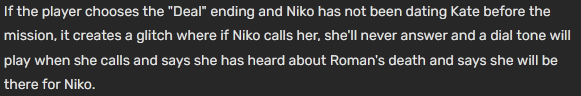 После прохождения GTA 4 на концовку со сделкой, звонит Кейт и говорит, что сожалеет о смерти Романа, и что Нико может позвонить ей в любой момент, если желает поддержки. Но игра все равно не дает это сделать, при звонке Кейт будут лишь гудки.