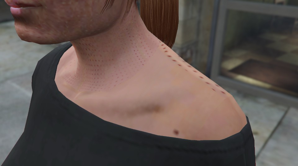Изначально была мысль, что сбились настройки персонажа, и эти пятна что то вроде прыщей. Но смена текстуры лица в меню создания/редактирование персонажа не решает проблемы. Так же при выборе более темной текстуры, эти точки появляются на щеках и становятся почти черными.