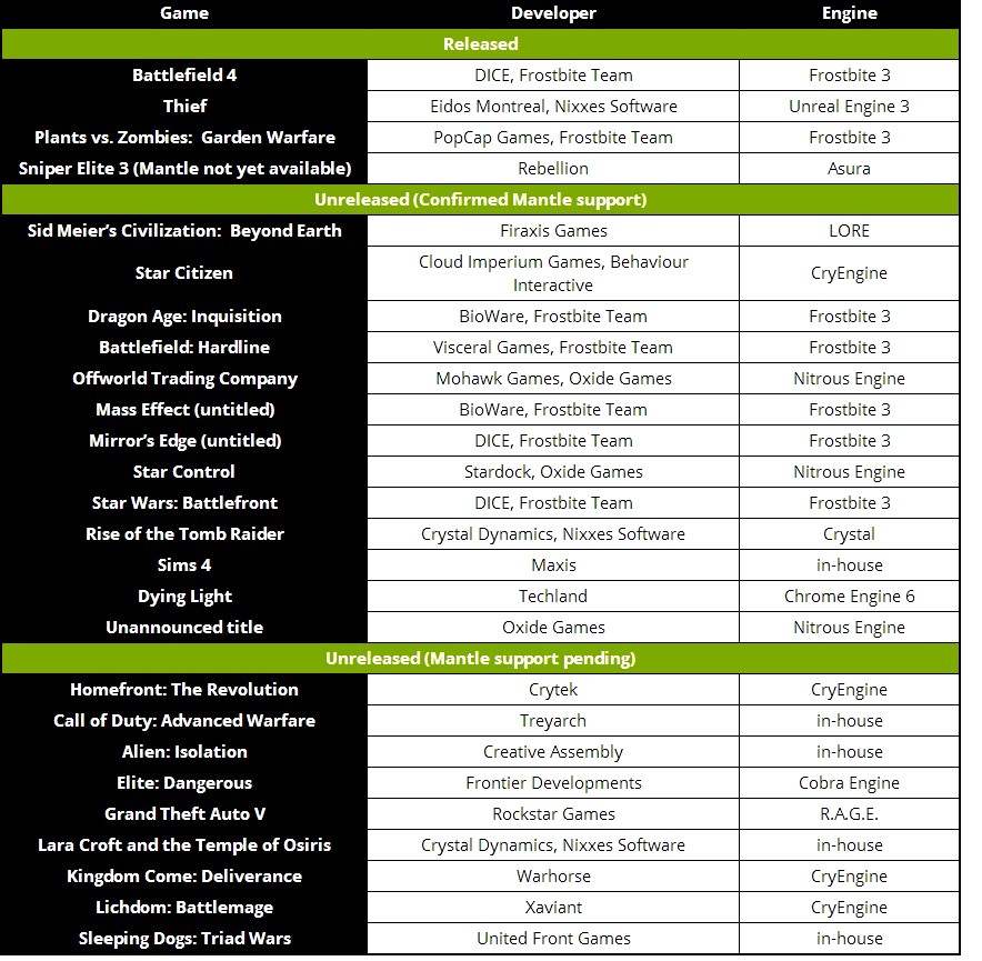 В сети появился список игр, которые должны получить поддержку API AMA – Mantle, которое повышает производительность на графических картах AMD. Это пока не официальный список, так что ждем подтверждения или опровержения. Согласно этому списку, поддержку Mantle вводят такие студии как Rockstar, Crytek, Treyarch, Creative Assembly и United Front Games. А среди тайтлов отмечаются: