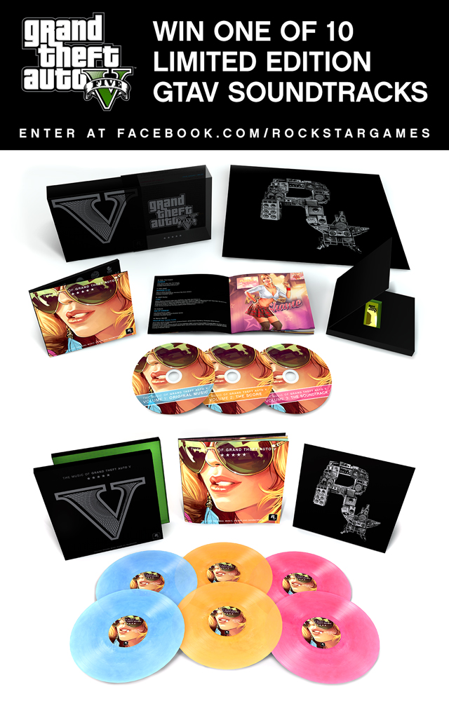 Объявлен розыгрыш музыкальной коллекции. 10 счастливчиков получат CD диски или виниловые пластинки серии GTA V Limited Edition Soundtrack. Розыгрыш призов проводится на официальной странице Rockstar в Facebook. Победители могут самостоятельно выбрать в качестве приза коллекцию CD или виниловые пластинки.