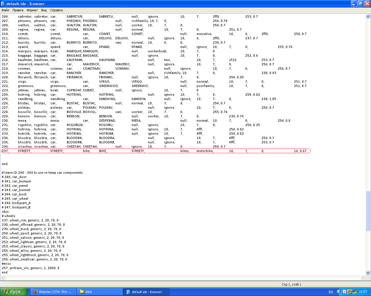 Хочу добавить в игру мотоцикл Streetfighter из Vice City Stories, добавил модель и текстуру в gta3.img , прописал строки в carcols. handling и default. Но при начале игры выдает ошибку. Что не так?!