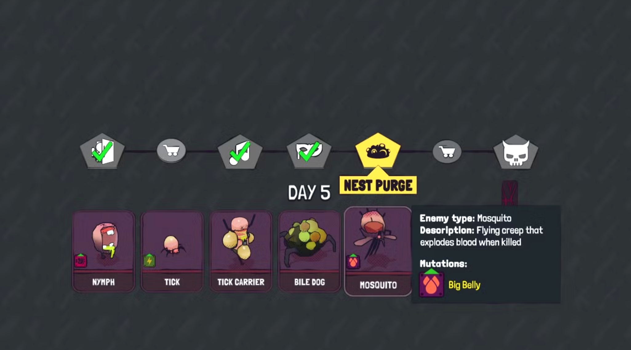 После завершения каждого уровня и выбора перков для своего персонажа, игра заставит вас выбрать как минимум одну мутацию, которая будет применена к определенному типу врагов до конца забега. Эти мутации всегда усложняют игру, усиливая врагов различными способами: добавляют новые свойства их атакам, дают им совершенно новые приемы или просто увеличивают их скорость.