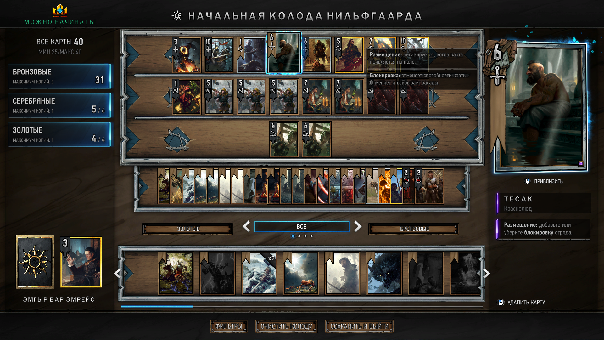 Ну для воорхиса нужна пара достаточно специфических лег типа Ваттье де Ридо и Лео Боннарта, в серебре цинтия, альбрых и кантарелла, ну они в принципе в любой деке нормально смотрятся, а, зеррит еще. Но и бронза там тоже специфична, это и мангонелы, разведчики, алимики, огненные скорпионы, даэрлянские пехотинцы, нильфгаардские рыцари которые по сути, в други архетипах бесполезны. Дека не сложная и весьма эффективна, но и довольно дорогая.