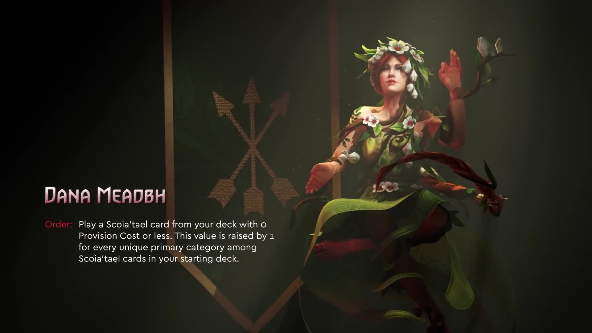 Сыграйте карту Скоя'таэлей из вашей колоды, чья стоимость найма не более 0. Увеличьте это значение на 1 за каждую уникальную основную категорию Скоя'таэлей в вашей стартовой колоде
