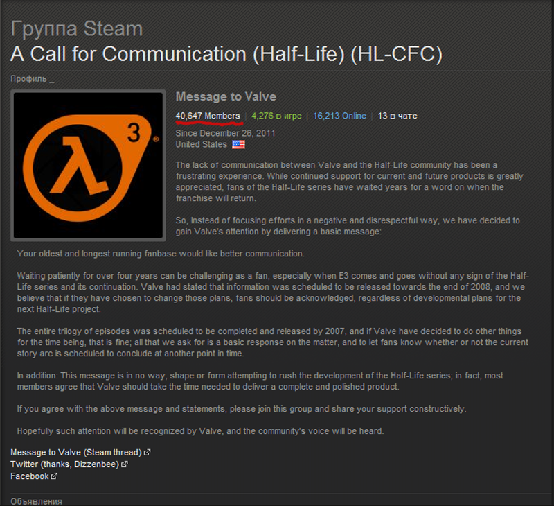 Группа A Call for Communication (Half-Life) В стим набрала уже более 40000 подписчиков браво! Признаемся это очень большое число фанатов которые просто хотят знать о делах Valve чуточку больше... Надеюсь что Valve не намерена мучать фанатов молчанием.