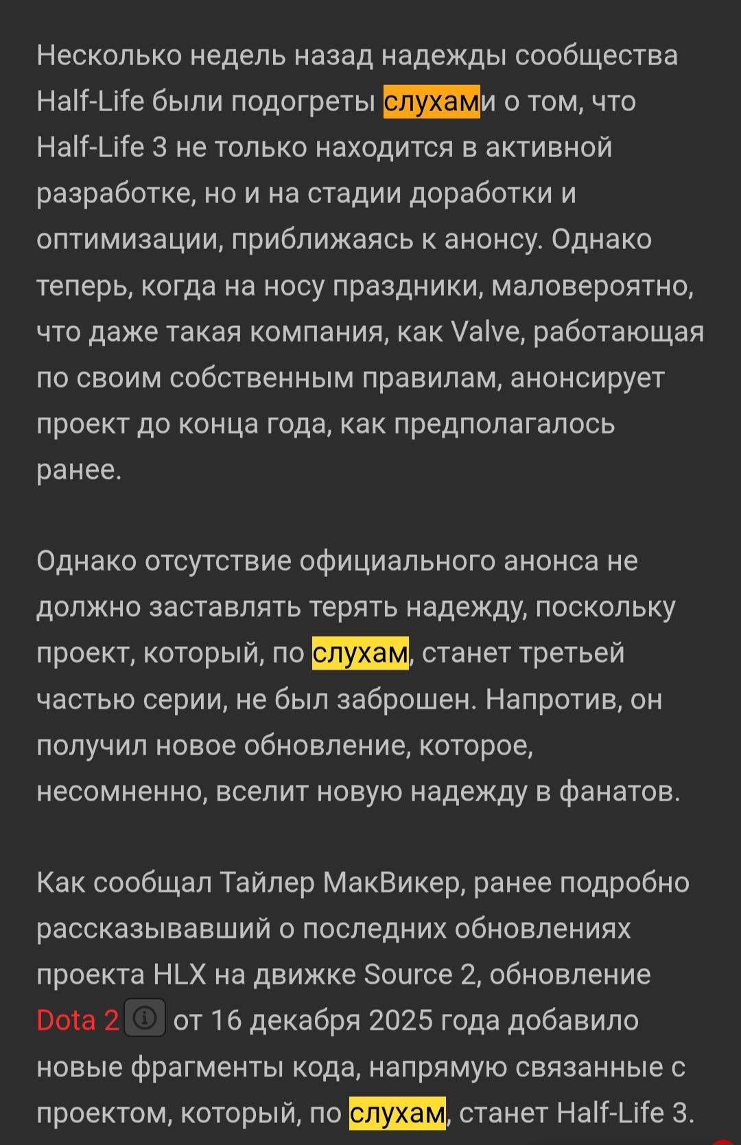 Как сообщал Тайлер МакВикер, ранее подробно рассказывавший о последних обновлениях проекта HLX на движке Source 2, обновление Dota 2 от 16 декабря 2025 года добавило новые фрагменты кода, напрямую связанные с проектом, который, по слухам, станет Half-Life 3.