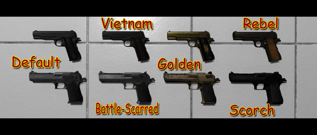 К пистолетам идёт по 3 дополнительных скина, которые находятся в папке "Custom Skins", которая лежит в папках самих пистолетов.