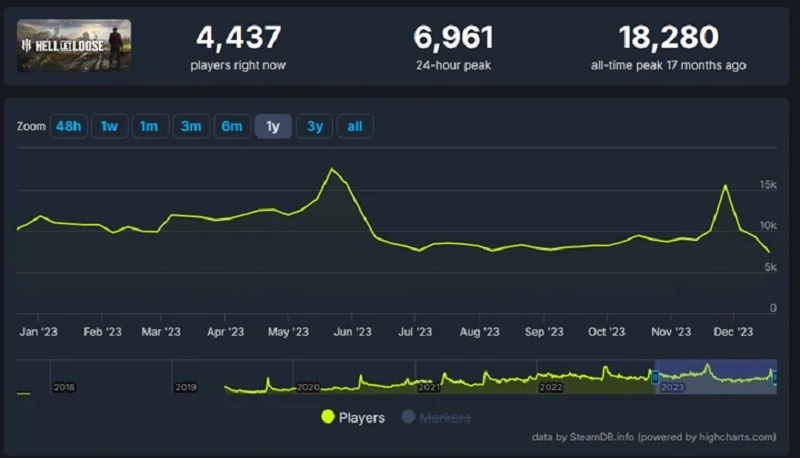 Таким образом, Hell Let Loose получит множество значительных изменений. Скорее всего, это реакция разработчиков на недавний худший период игры. Тенденция к снижению числа активных игроков наблюдается уже давно. Сейчас в игру одновременно играют в среднем от 4 до 10 тысяч человек (по данным SteamDB), в то время как всего несколько месяцев назад мы наблюдали 10-17 тысяч игроков одновременно.