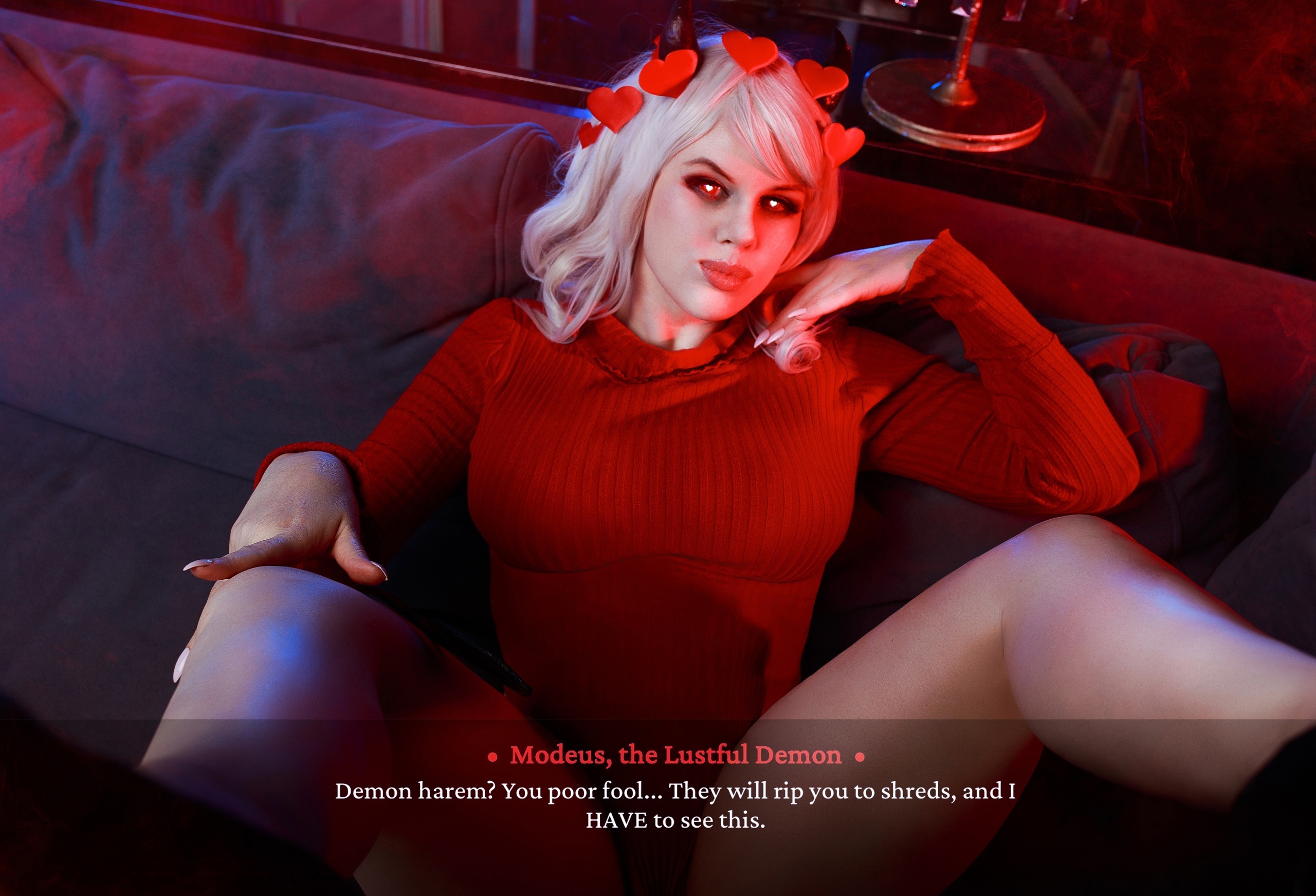 Несмотря на миловидную внешность, Модеус - самая похотливая и испорченная демоница из всего гарема Адбирателя. Все ее мысли связаны с развратом, в романтика и любовь ей чужды. Косплей на Модеус сделала Алиса Арефьева.