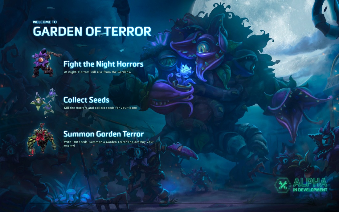 «Сад Ужасов» — новое поле боя с тремя линиями, где игрокам предстоит сражаться в условиях смены дня и ночи. С наступлением темноты, обзор игроков станет хуже, а нейтральные наёмники будут заменены ночными чудовищами. Команды будут бороться не только за дневное время, но и за семена — ключевую составляющую уникальной механики данной карты. Любой игрок команды, собравший 100 семян, может щелкнуть правой кнопкой мыши по участку плодородной земли на своей базе, чтобы призвать могучий Ужас Садов