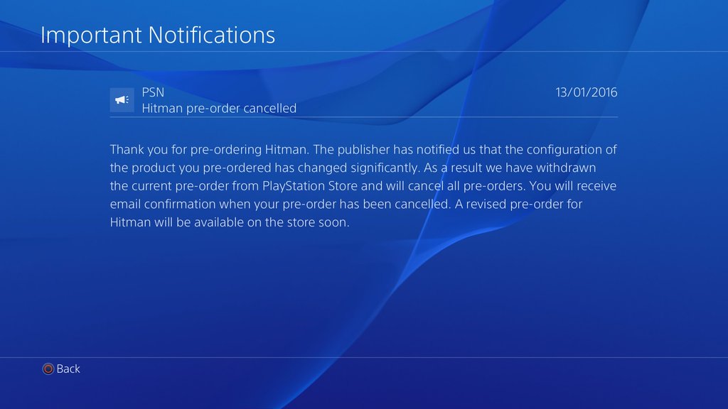 Те, кто предзаказали Hitman в PlayStation Store, получили уведомление о том, что предзаказы отозваны из-за "значительного изменения конфигурации продукта".