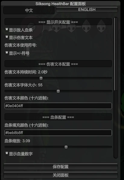 Для настройки параметров мода необходимо изменить файл BepInEx/config/Xiaohai.Silksong_HealthBar.cfg