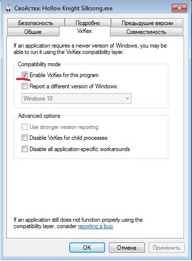 Silksong на windows 7 запускается через vxkex