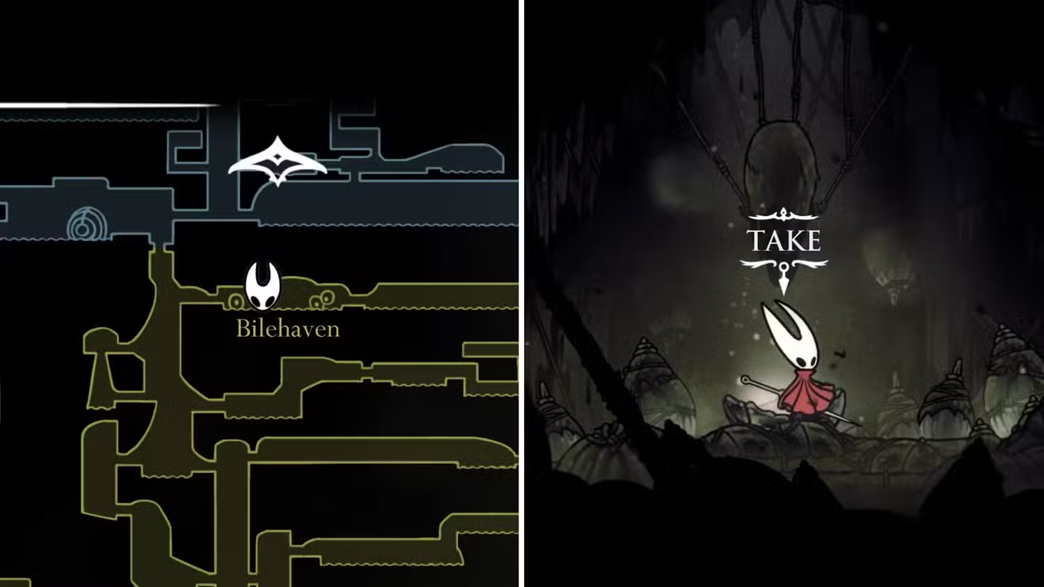 - Получить Душу Отшельника: Найдите Колокольного Отшельника в трубе под Тропой Колоколов в Беллхарте. Чтобы попасть туда, нужно разрушить иллюзорную стену в правой части комнаты с Тропой.