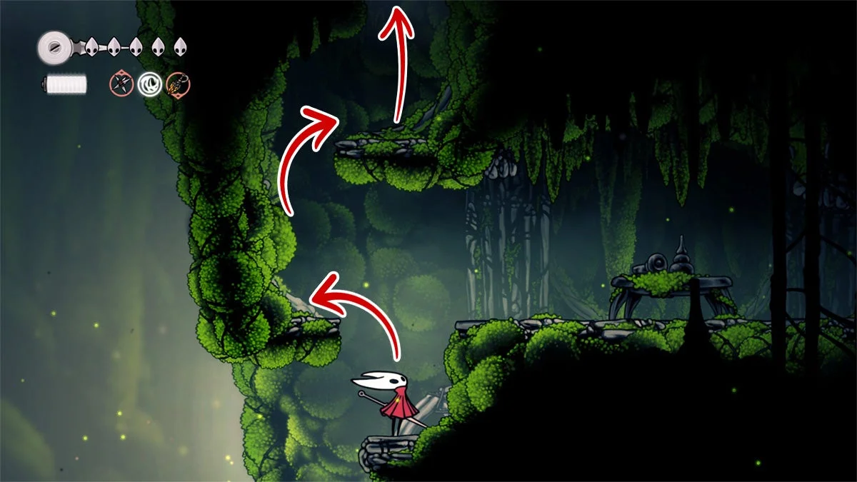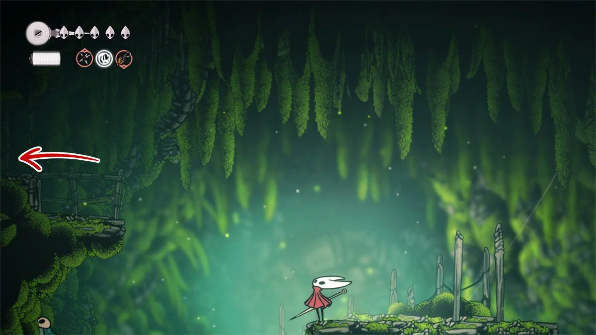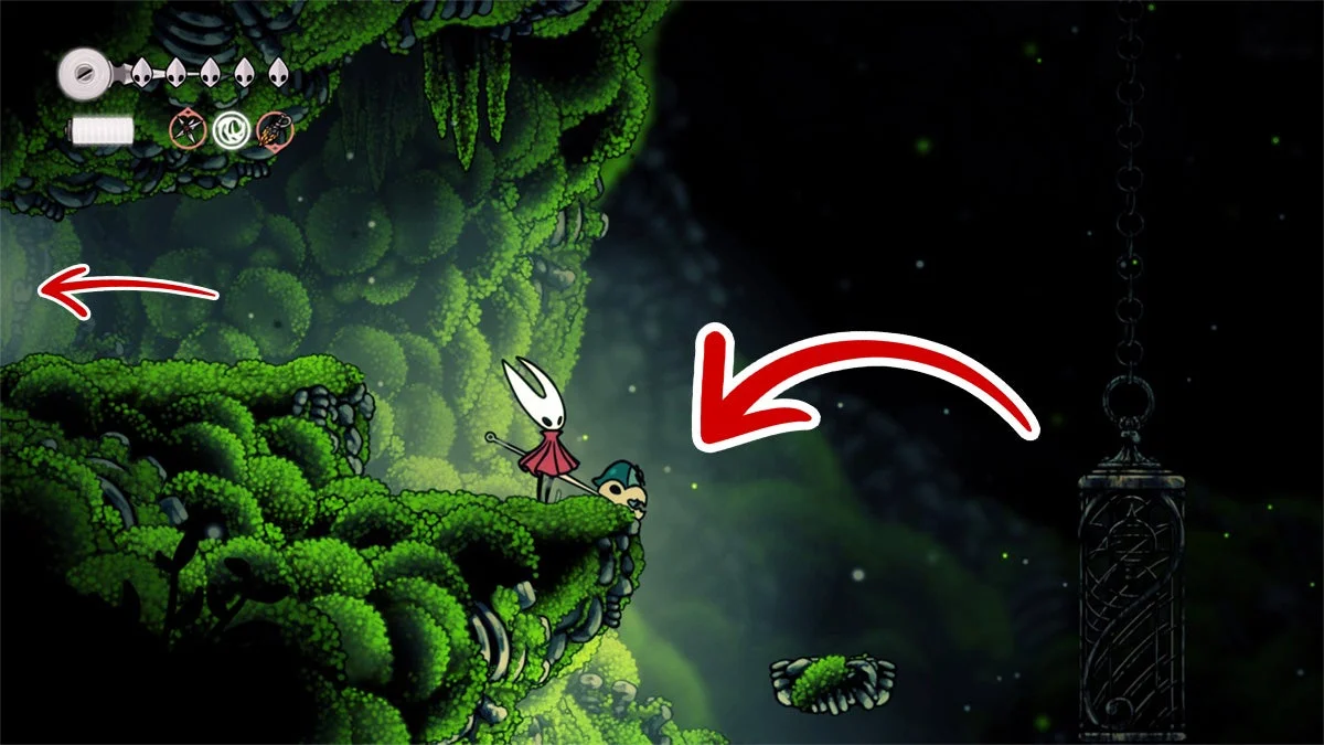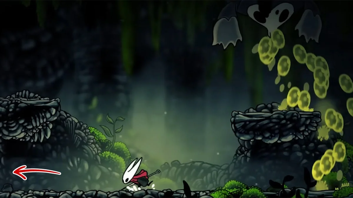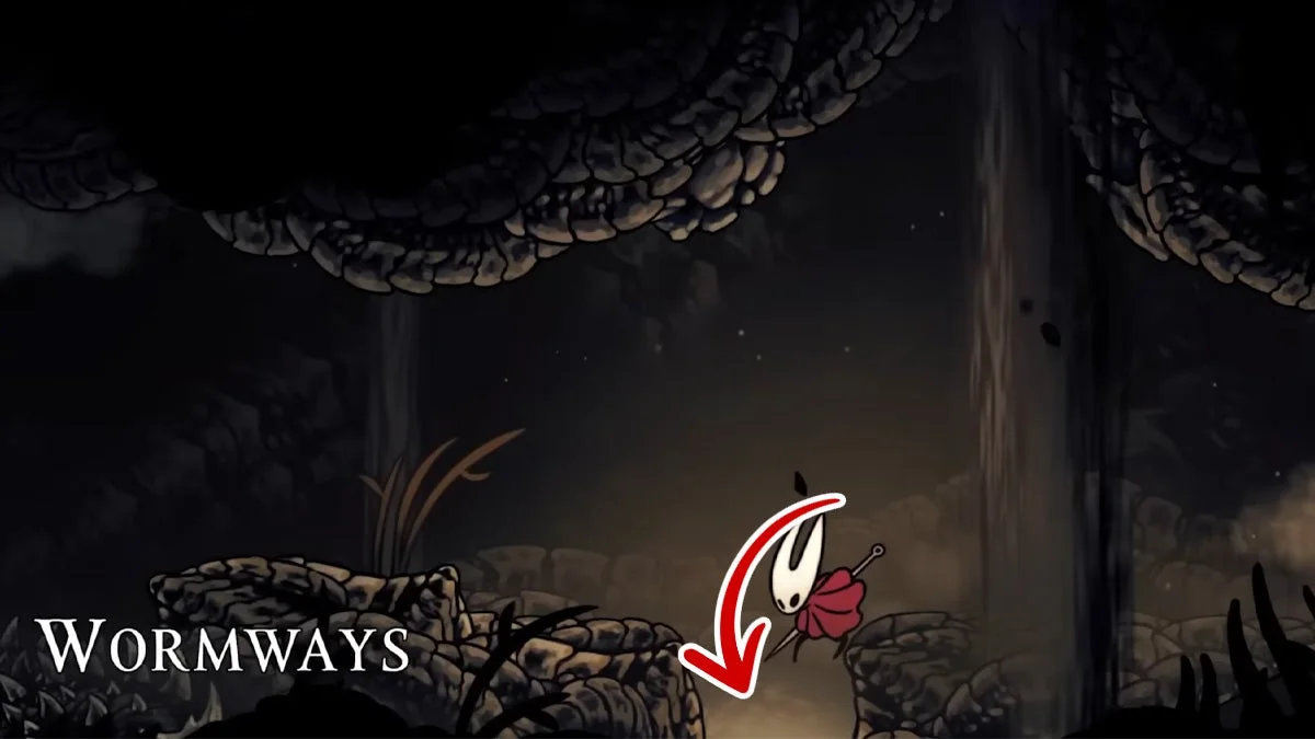 Продвигайтесь влево, наблюдая за облаками пыли — они указывают, где черви прорываются сквозь потолок. Спускайтесь в первую же дыру и двигайтесь по туннелям, избегая шипов. Держитесь правой стороны, пока не дойдёте до выступа с паломником-улиткой. Ударьте его, а затем продолжайте спуск вниз.