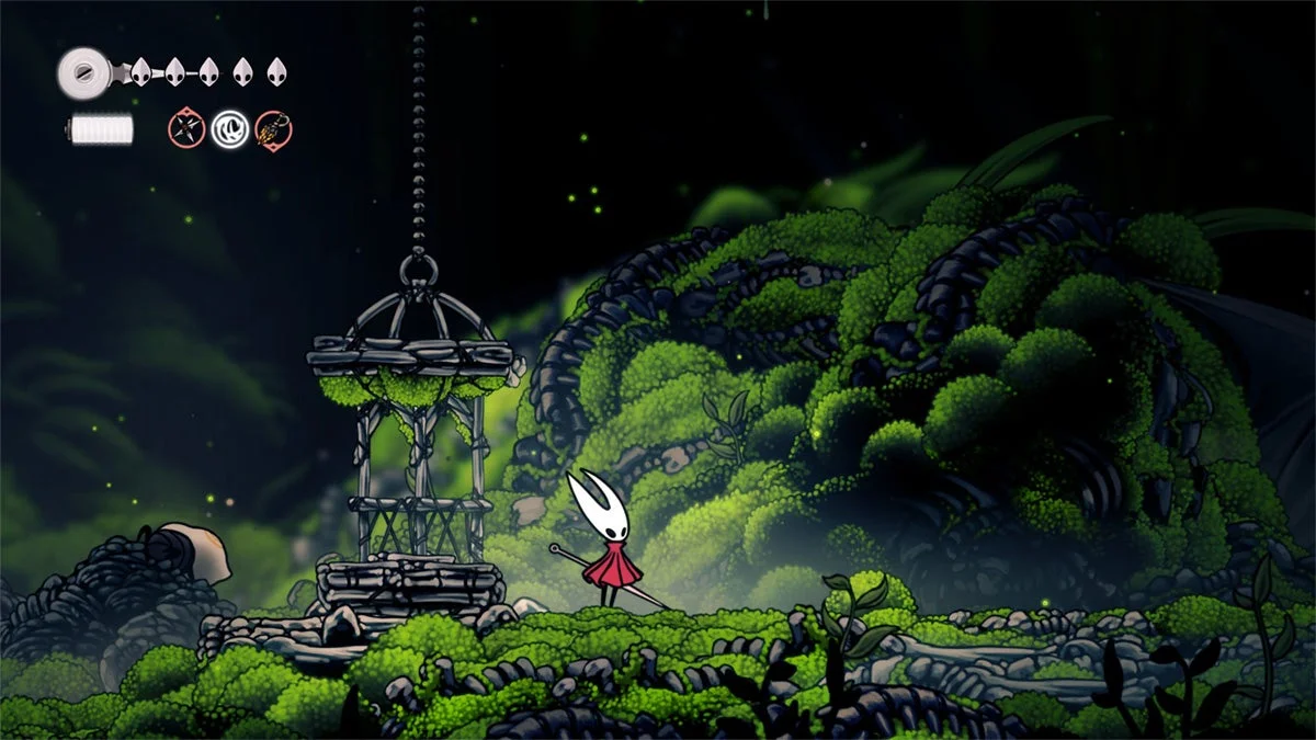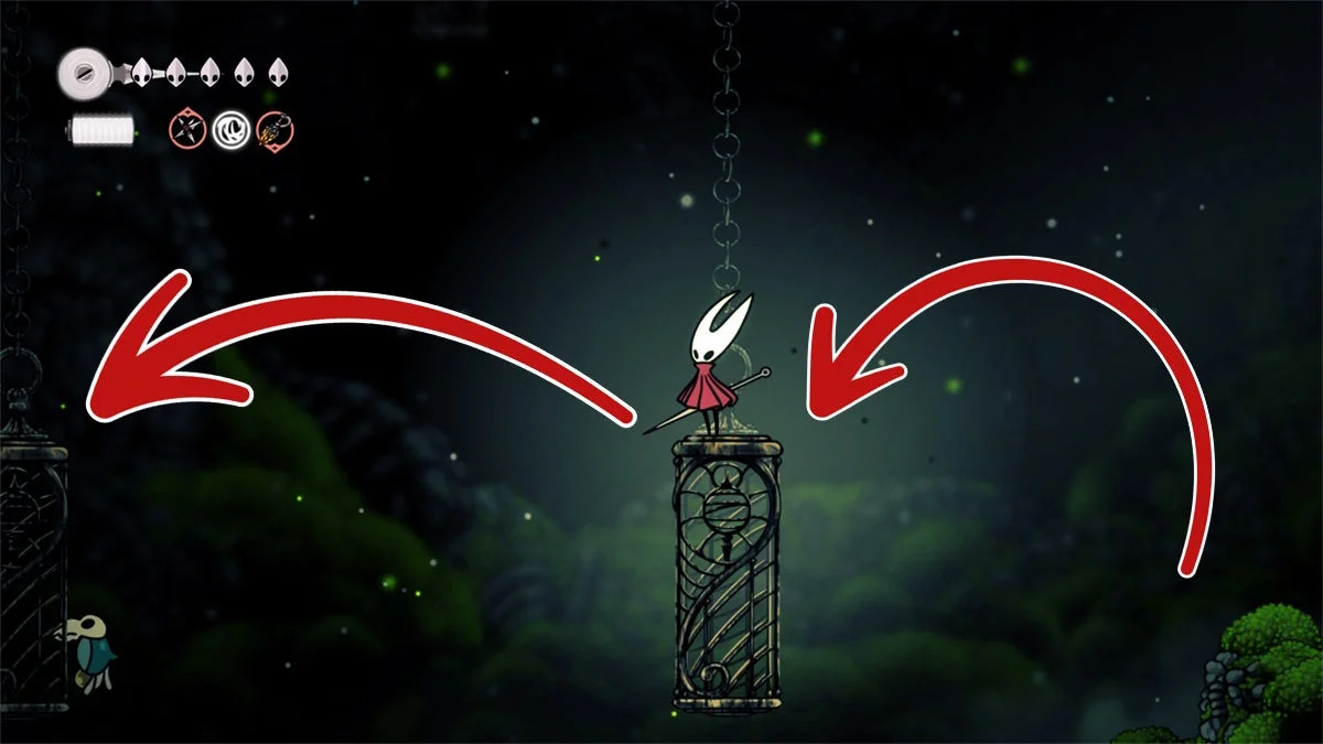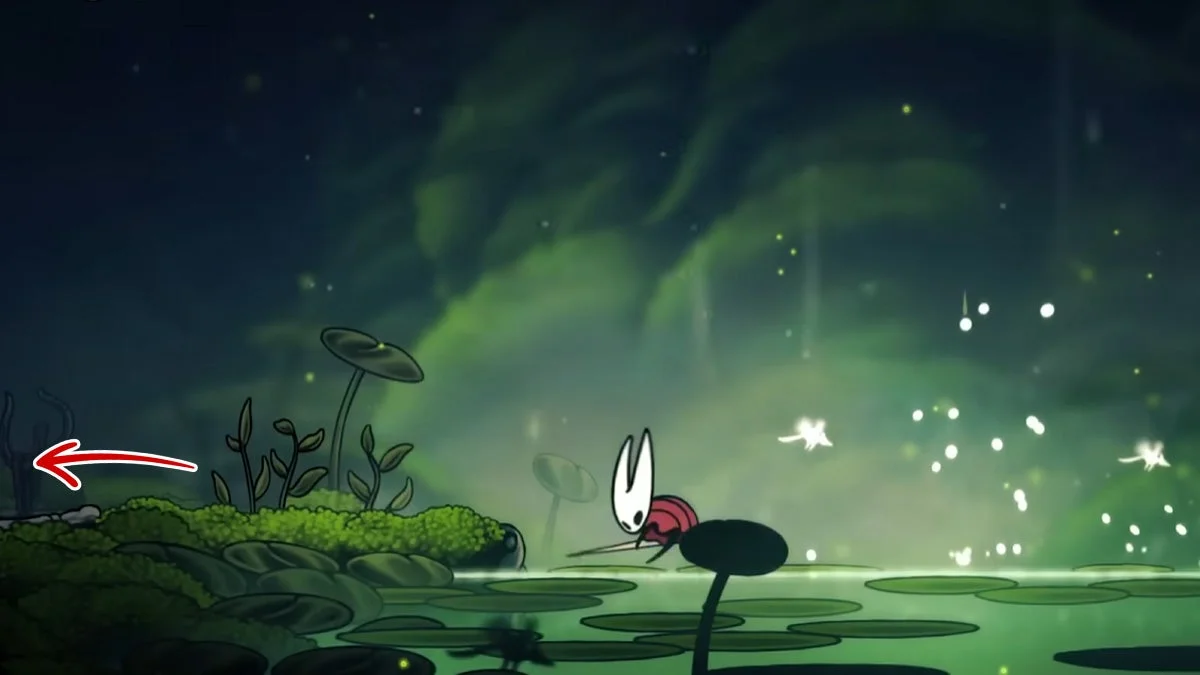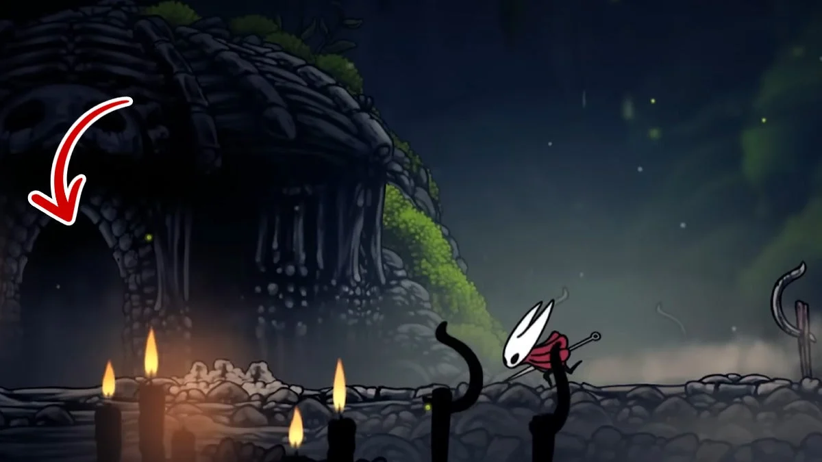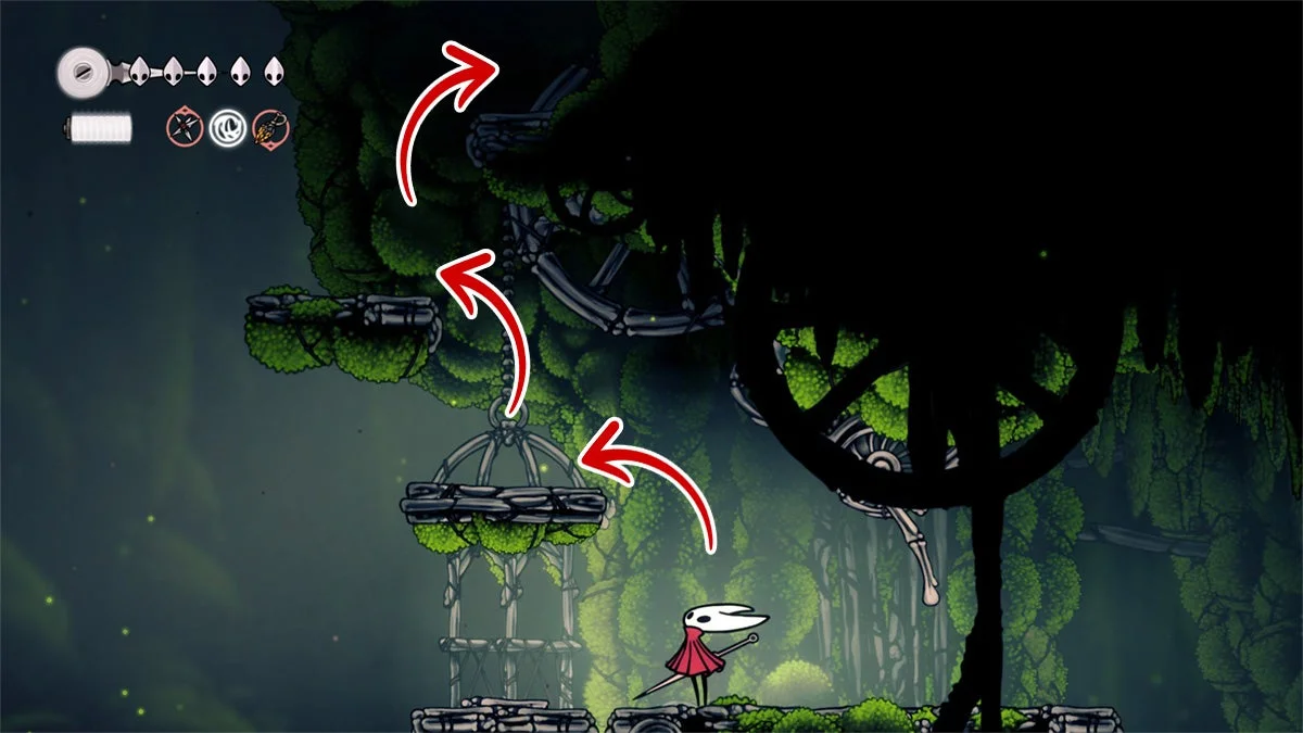 Продвигайтесь влево, наблюдая за облаками пыли — они указывают, где черви прорываются сквозь потолок. Спускайтесь в первую же дыру и двигайтесь по туннелям, избегая шипов. Держитесь правой стороны, пока не дойдёте до выступа с паломником-улиткой. Ударьте его, а затем продолжайте спуск вниз.