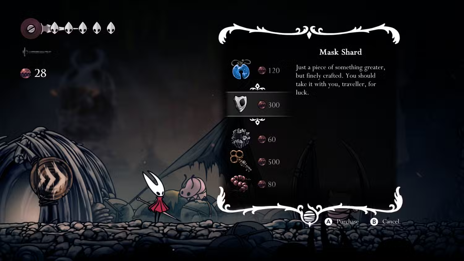 - Сбор фрагментов масок — за каждые четыре найденных фрагмента увеличивается максимальное здоровье Хорнет.