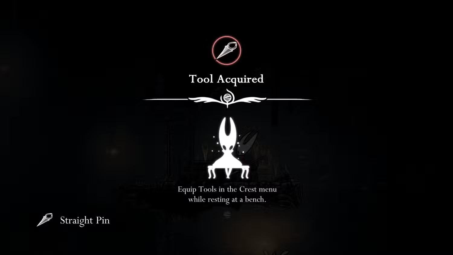 - Инструмент "Прямая булавка": Это инструмент, который Хорнет может экипировать, чтобы запускать небольшой снаряд вперед, наносящий врагам обычный урон. Чтобы найти его, нужно зайти в камеру Гриндула и запрыгнуть в камеру выше. Предмет будет лежать на полу.