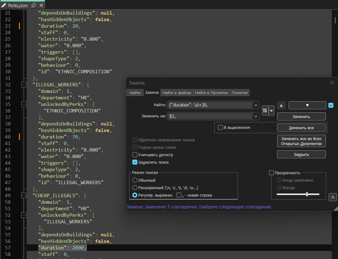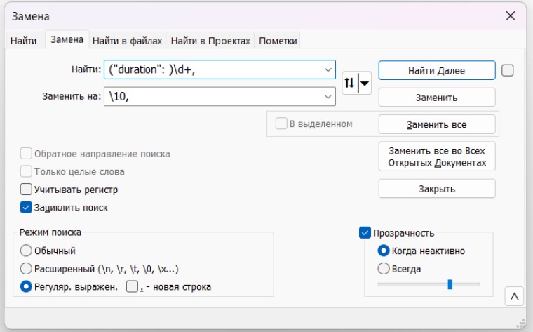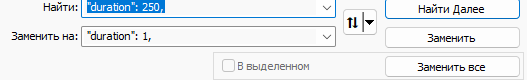 ("duration": )\d+, - В поле "Заменить на" вставьте: