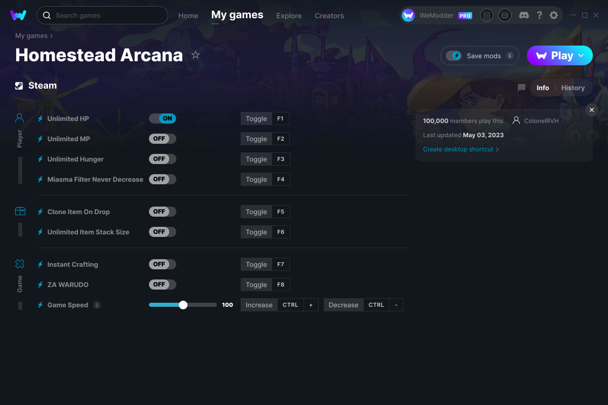 - Запускаем игру через WeMod на кнопку Play.
