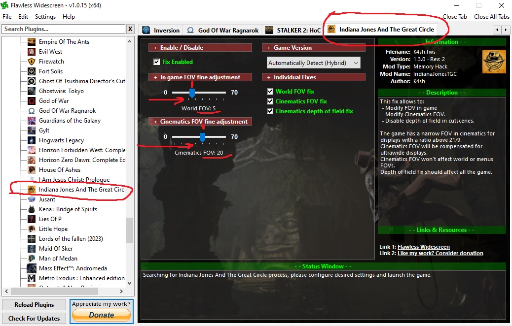 с помощью проги FlawlessWidescreen и установленных последних плагинов версии от автора K4sh plugins в эту прогу в виде закинутого в папку проги архива Flawless_Widescreen_Plugins_1.0.48a скачанного с сайта https://cs.rin.ru/forum/viewtopic.php?f=14&t=138197 ( можно-нельзя ссылки вставлять на сторонние ресурсы подобного рода... но без ссылки не найдешь никак этот плагин для профиля игры на индиану) камеру от первого лица можно исправить ( будет похожа на камеру как в шутанах. т.е. обзор будет шире за счет отдаления камеры + в роликах можно вообще отдалить камеру отдельным ползунком) из самой игры этого сделать нельзя просто крутя FOV.