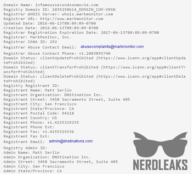 И снова, интересные новости из уст Твиттер-аккаунта Nerdleaks. Источник утверждает, что компания Sony зарегистрировала домен infamoussecondsonmovie.com, что косвенно подтверждает факт разработки фильма по одноимённой игре.