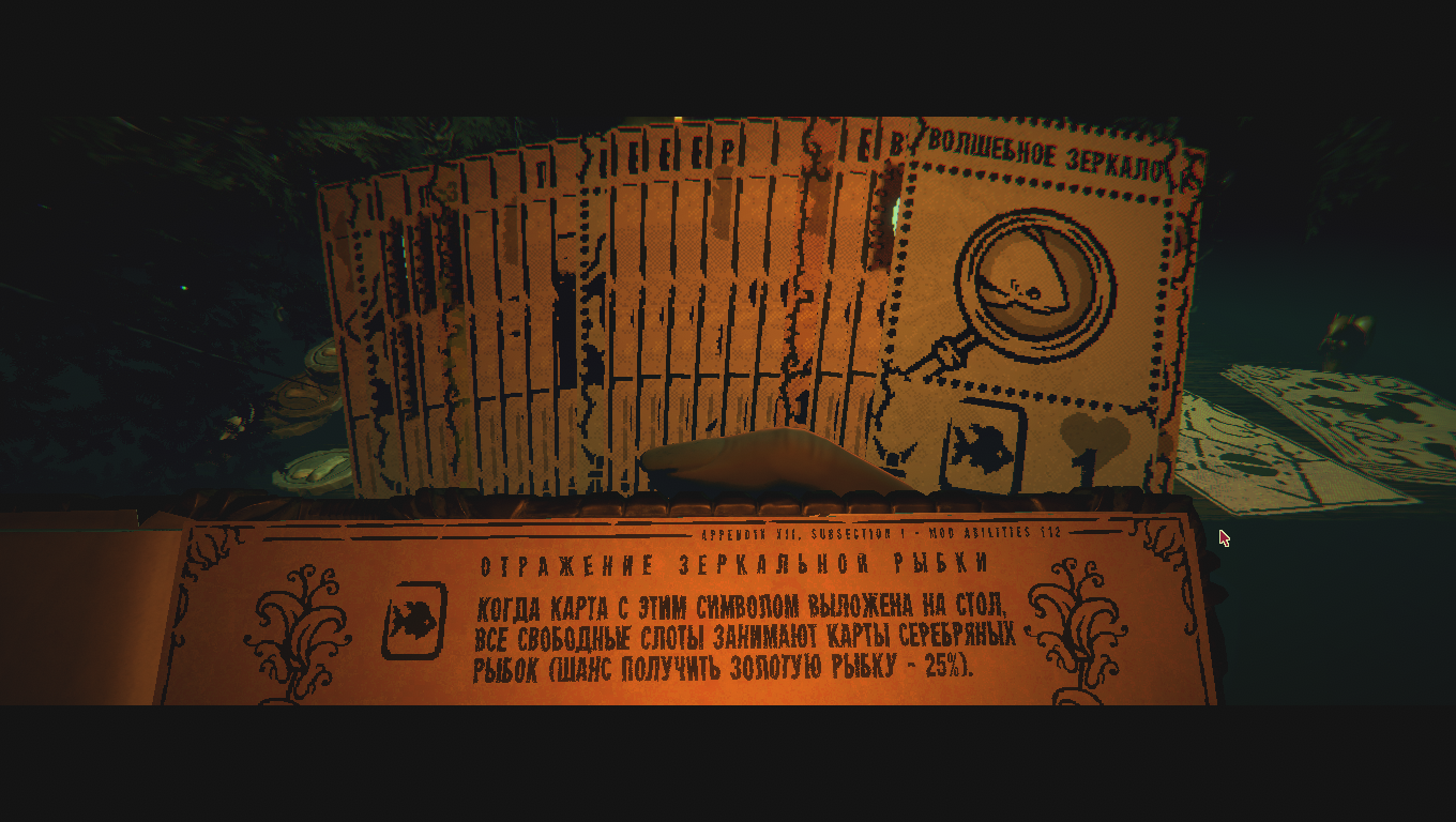 - Способности: у карты «Разбитое зеркало» нет способностей, а карта «Волшебное зеркало» будет иметь ещё одну новую способность - «Отражение зеркальной рыбки». Когда карта с этим символом выложена на стол, все свободные слоты занимают карты серебряных рыбок (шанс получить золотую рыбку - 25%).