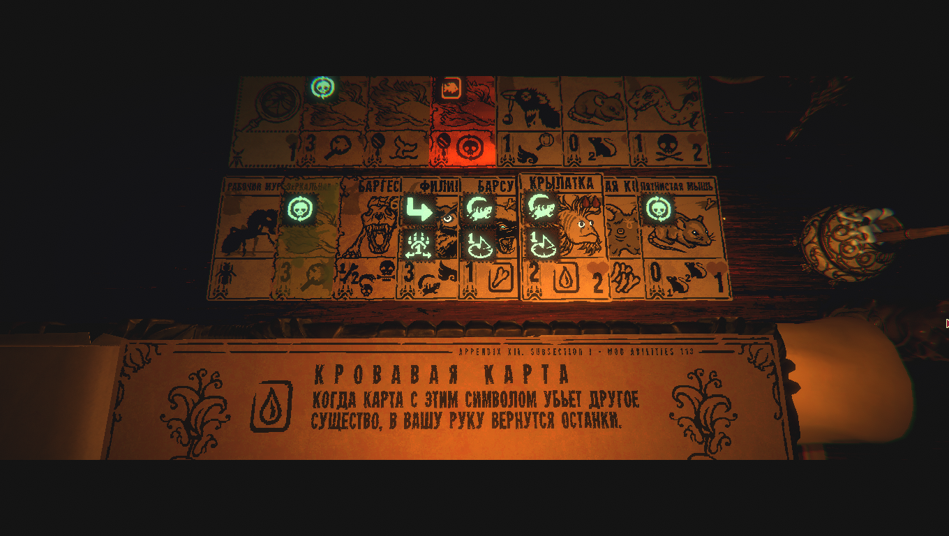 - Способности: Добавляет в игру новую способность «Кровавая карта». Когда карта с этим символом убьет другое существо, в вашу руку вернутся останки.