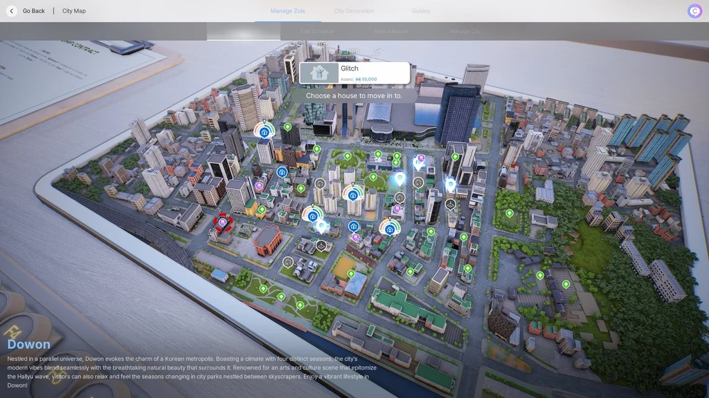 Некоторые жилые зоны отмечены темно-серым значком со стрелкой вниз. Это пустые земельные участки, которые стоят дешевле готового жилья, но требуют строительства здания перед заселением. Этот вариант подойдет игрокам, предпочитающим создать уникальный дом с нуля.