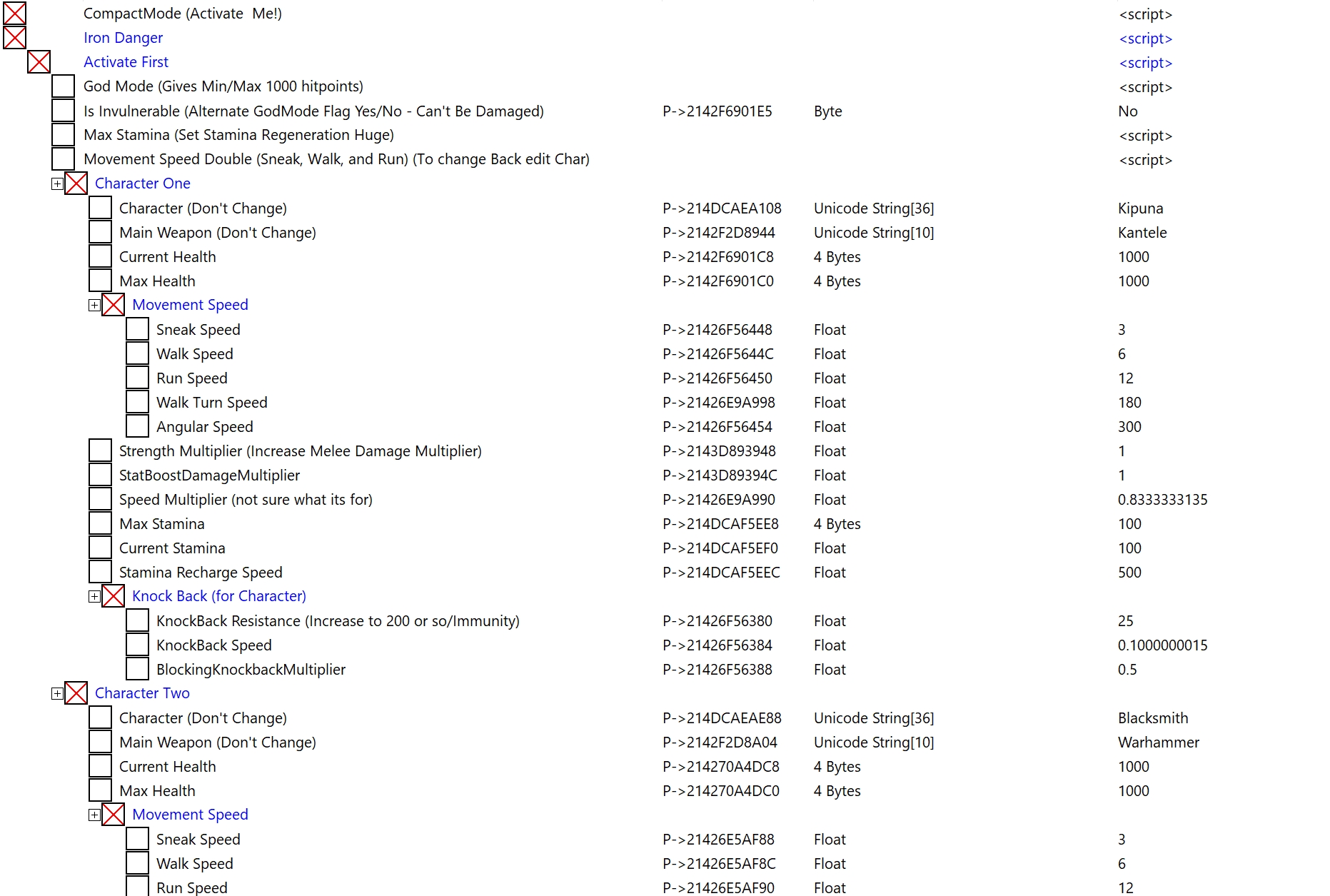 Испытал, - активирую только God Mode и Max Stamina, - результат есть!, только, перед загрузкой нового уровня, надо деактивировать эти читы, чтобы игра не вылетала. Для чего все остальные читы в таблице, я не понимаю!? В игре, кроме здоровья, никаких других параметров персонажей не вижу!? Но, с таблицей, гораздо реже приходится пользоваться в игре её хитрой "кардиограммой". :-)