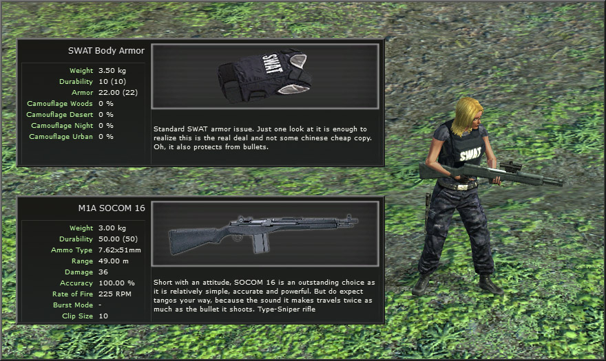 - Добавлена новая броня и одежда: - Dyneema vest, SWAT Vest, Concealable ballistic vest, Combat Medic Vest, Dragonskin Body Armor; - Medic uniform, CQB uniform, Medic helmet, Trooper helmet; - Blackhawk HPFU Pants, Blackhawk HPFU Jacket;