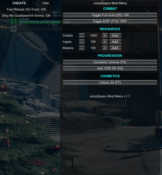 Мод-меню для игры Jump Space с множеством чит-функций, включая улучшения для боя, корабля и прогрессии. Имеет встроенную защиту от чит-системы игры.