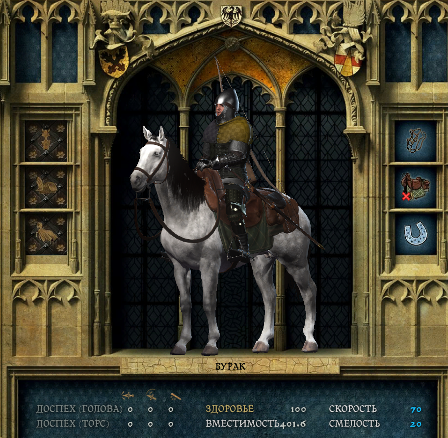 Катаюсь на вонючке. На Боевом коне Йенда - коняга 5 уровня, можно купить в торговца в деревне Мрхоеды. Седло охотничье 4 сумки. Рыцарские подковы + шпоры рыцарские + шанфрон с критнетом + высококачественная уздечка.
