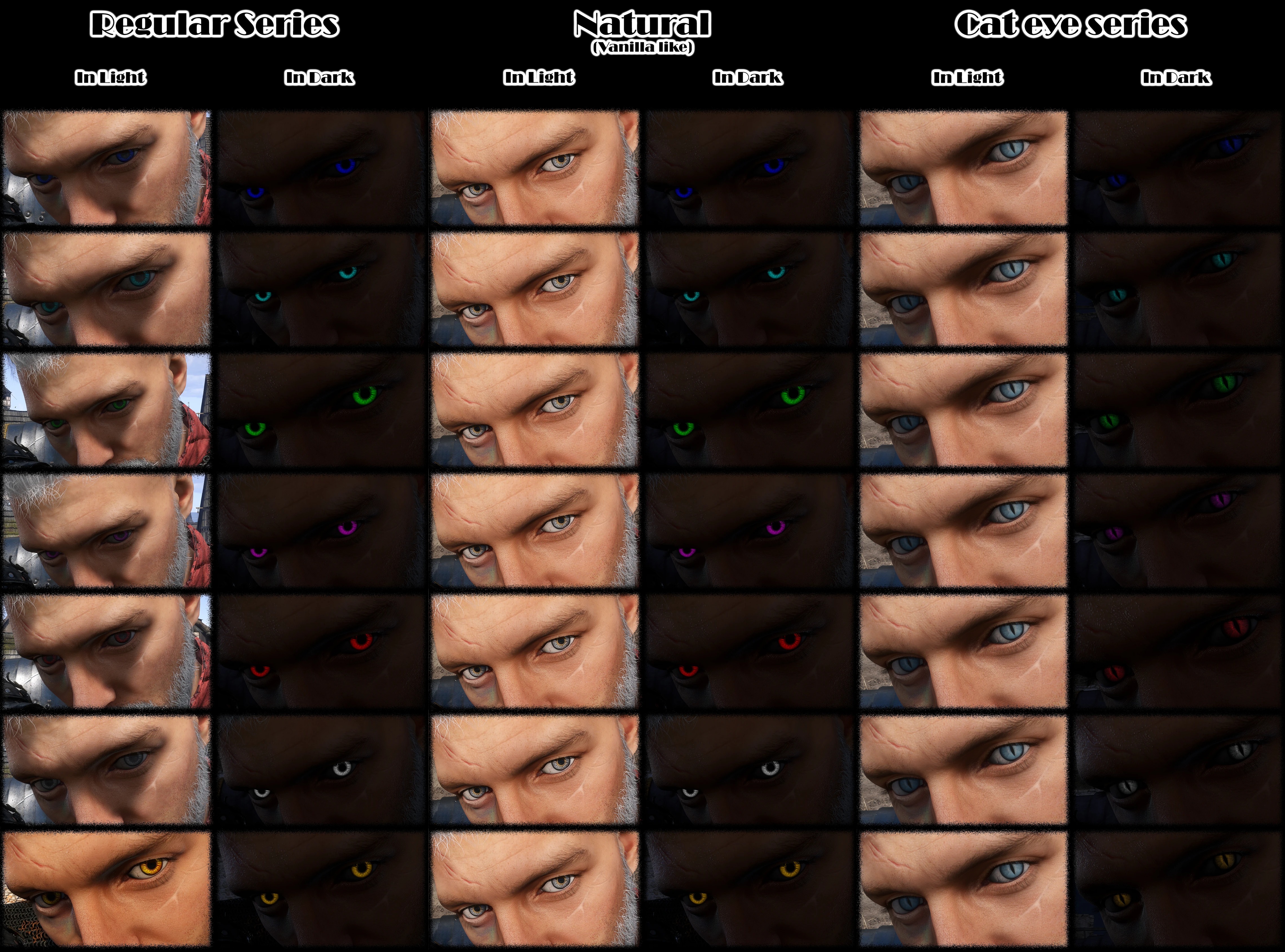 - Cat - кошачьи зрачки; цвет радужки на солнце - всегда голубой, в темноте - соответствует выбранному цвету