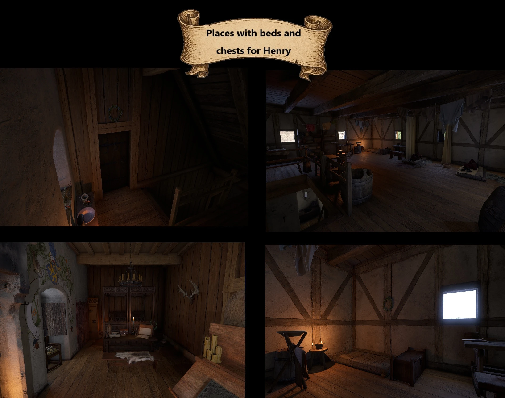 - Индржих (Генри) может спать: в правой комнате на втором этаже, которую он делит с Розой (рихтарж переехал в соседнюю комнату рядом с лестницей), либо на третьем этаже с другими стражниками. Сон в новых кроватях не сохраняет игру. Рядом с кроватями на втором и третьем этажах можно найти личный сундук игрока;