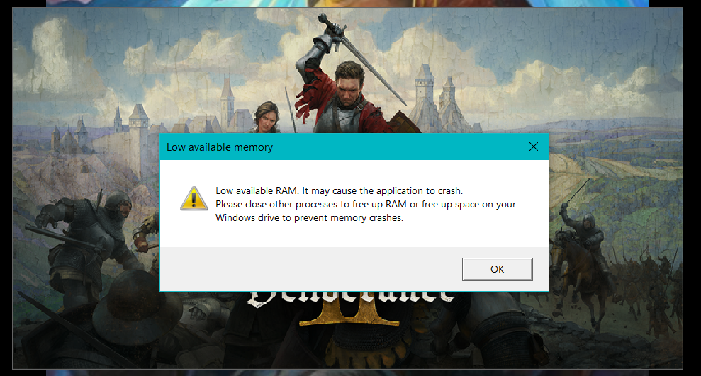 При запуске вылезает вот такое окно. Играю уже неделю, но такое вылезает только сегодня. В настройках ничего не менял. Оперативная память 16 гб. В момент запуска память используют только системные процессы на 16%. Всегда только 16-17% было, ничего не менялось.