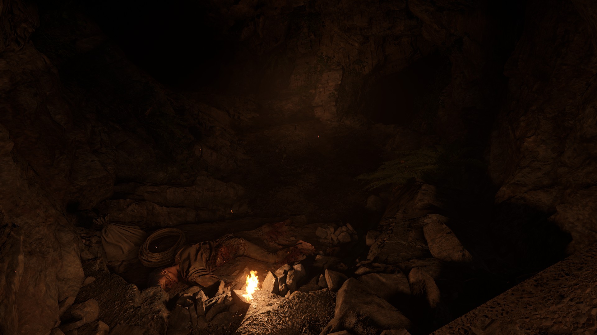 - Локация представляет собой пещеру с костром и телами (см. галерею изображений выше).