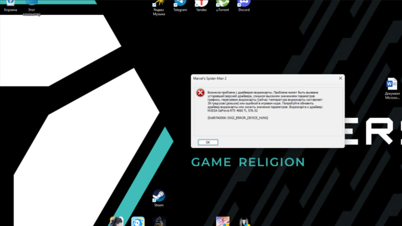 История, играл я в изначально в The last of us 2, вроде бы все было отлично, все ролики и сама игра шли отлично на высоких настройках. После прохождения половины игры, начались зависания в катсценах и вылет с такой ошибкой и они не прекращались. Я решил запустить 1 раз человека паука 2, там тоже начались зависания в катсценах и вылет с данной ошибкой. Вот сегодня скачал Dying light 2, запустил и показалось что вроде бы нормально в было, но на моменте в первой же катсцене опять провисания и вылет, только уже без ошибки.