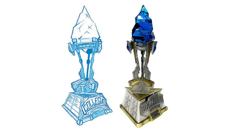 Оттолкнувшись от набросков, сделанных его другом Томом, Крикс потратил четыре недели, чтобы собрать девять трофеев для League of Legends’ North American Collegiate Championship в прошлом году. К томум моменту, как дизайн был завершён, у него был 21 день.