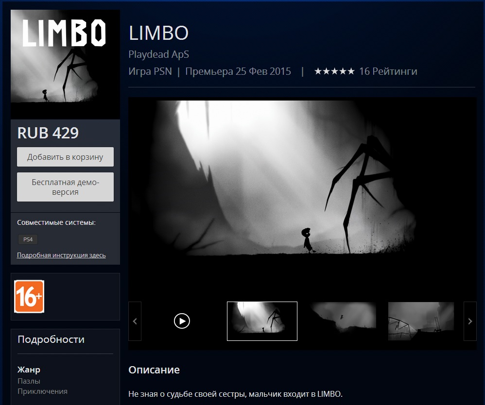Limbo вышел на PS4. Купить можно здесь. Ссылка на PS Store.