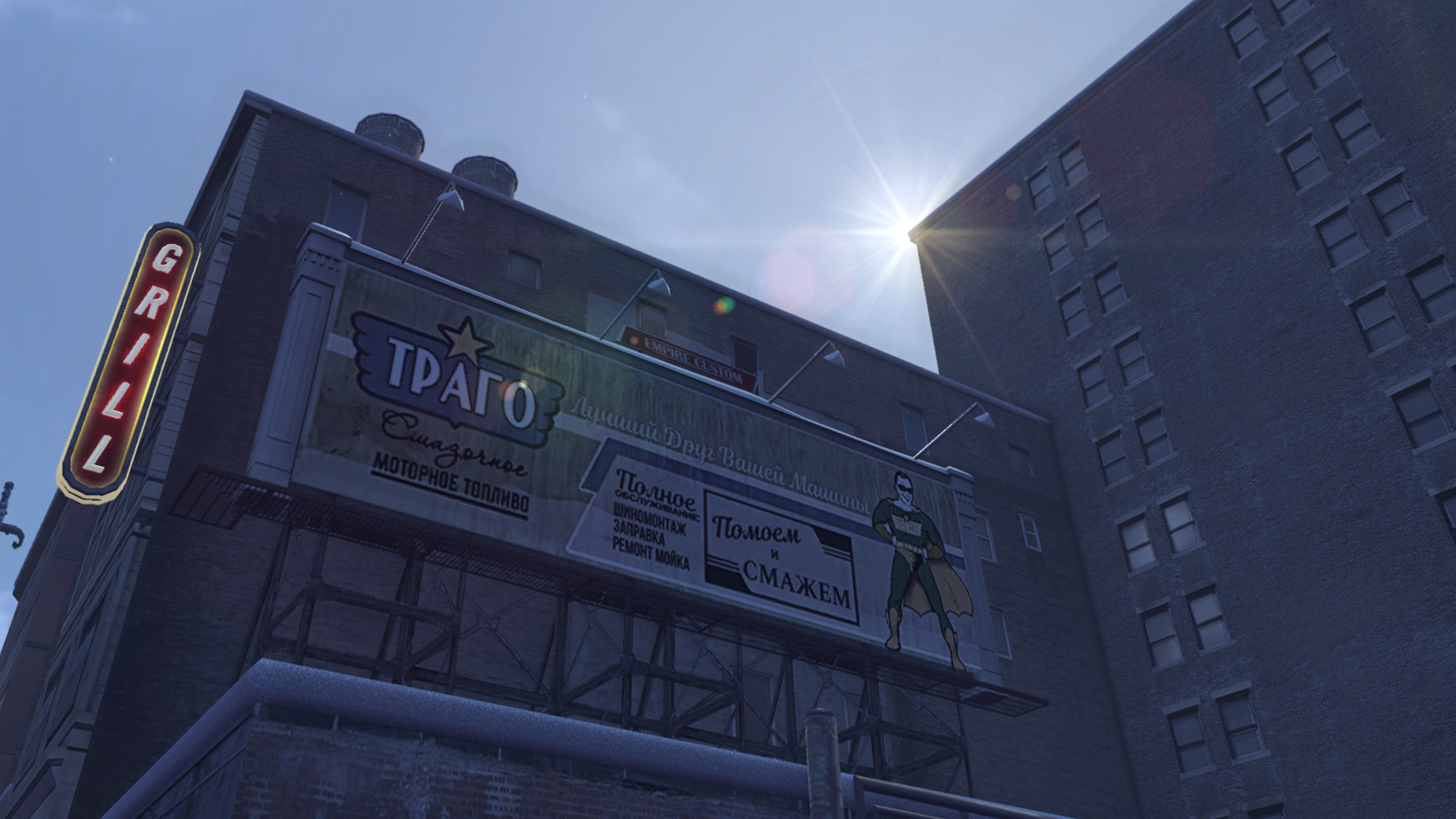 В Mafia 2 есть множество билбордов, и я решил полностью локализовать их на русский язык. При создании русификатора заголовков и слоганов я пренебрег дословным переводом текста ради его благозвучности, однако весь оригинальный посыл мной был успешно передан. То же касается и названий брендов: где-то я воспользовался простым транслитом, а где-то — полной адаптацией.