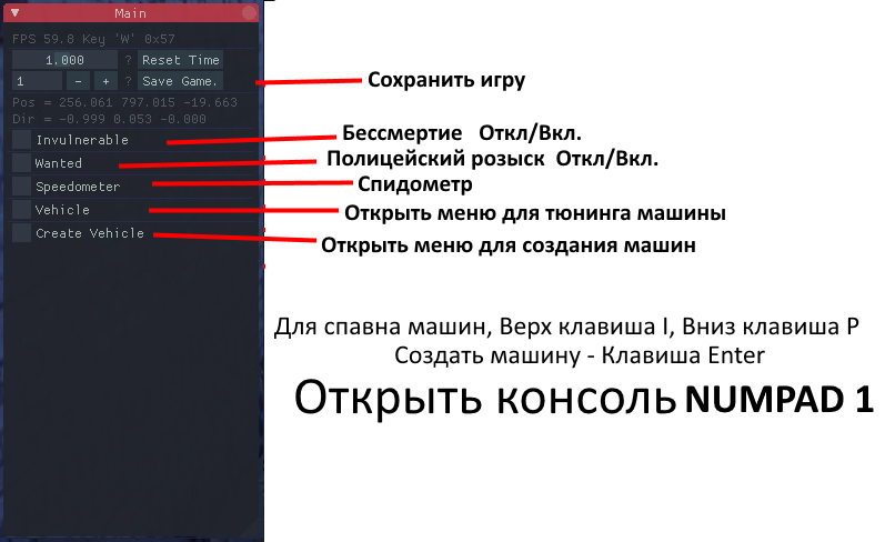 Сохранить игру, Бессмертие, Заспавнить Любых Персонажей(Create Ped), Сменить Скин Главного героя(Change Ped) и др!