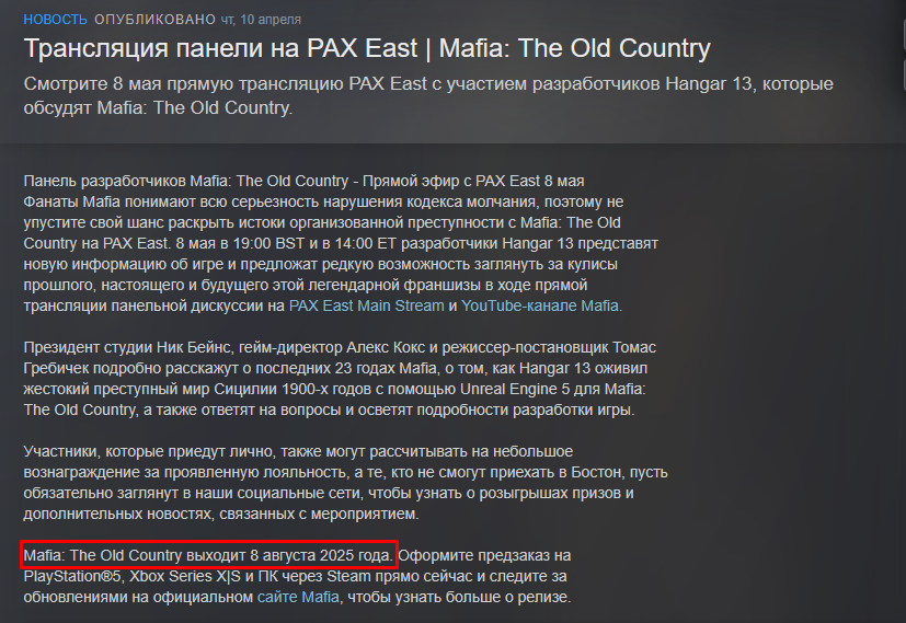 Одна из самых интересных утечек за последние несколько часов касается Mafia: The Old Country, новой части в знаменитой криминальной саге от 2K и Hangar 13. Согласно тому, что появилось на странице Steam, игра должна официально выйти 8 августа 2025 года. Хотя дата не была публично объявлена разработчиками, пост, похоже, проскользнул по ошибке, в результате чего заранее была раскрыта часть информации, которая, вероятно, предназначалась для более масштабного объявления.