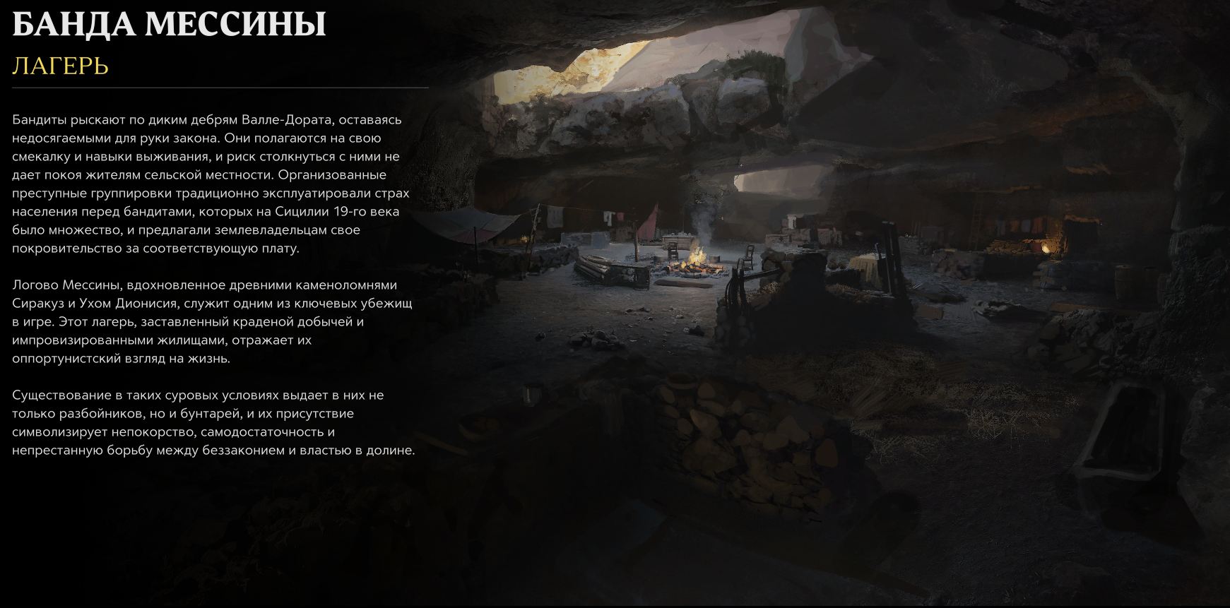 Логово Мессины, вдохновленное древними каменоломнями Сиракуз и Ухом Дионисия, служит одним из ключевых убежищ в игре. Этот лагерь, заставленный краденой добычей и импровизированными жилищами, отражает их оппортунистский взгляд на жизнь.