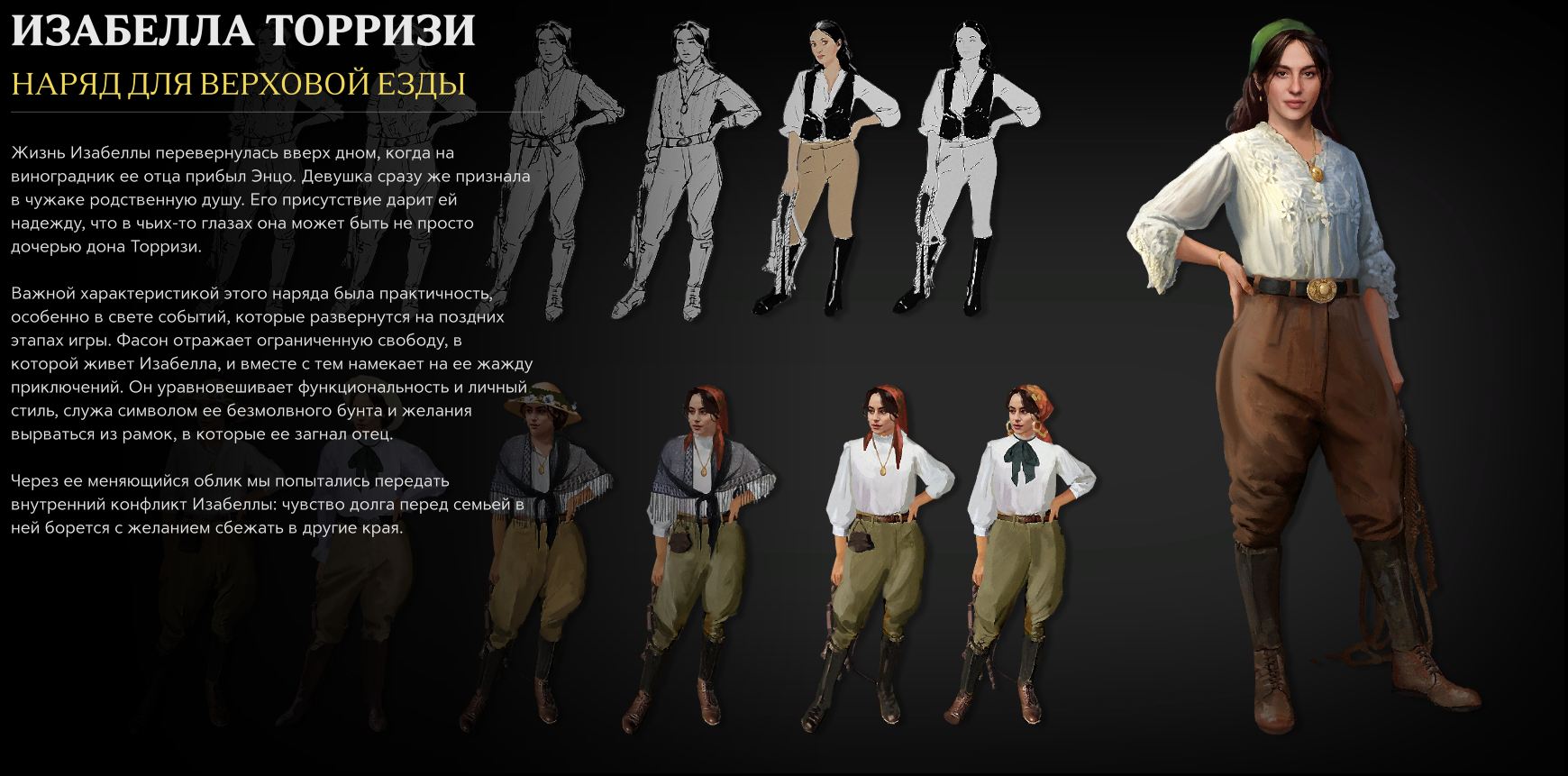 Важной характеристикой этого наряда была практичность, особенно в свете событий, которые развернутся на поздних этапах игры. Фасон отражает ограниченную свободу, в которой живет Изабелла, и вместе с тем намекает на ее жажду приключений. Он уравновешивает функциональность и личный стиль, служа символом ее безмолвного бунта и желания вырваться из рамок, в которые ее загнал отец.